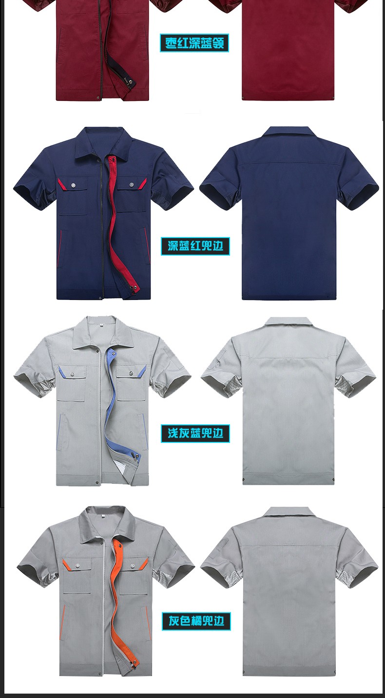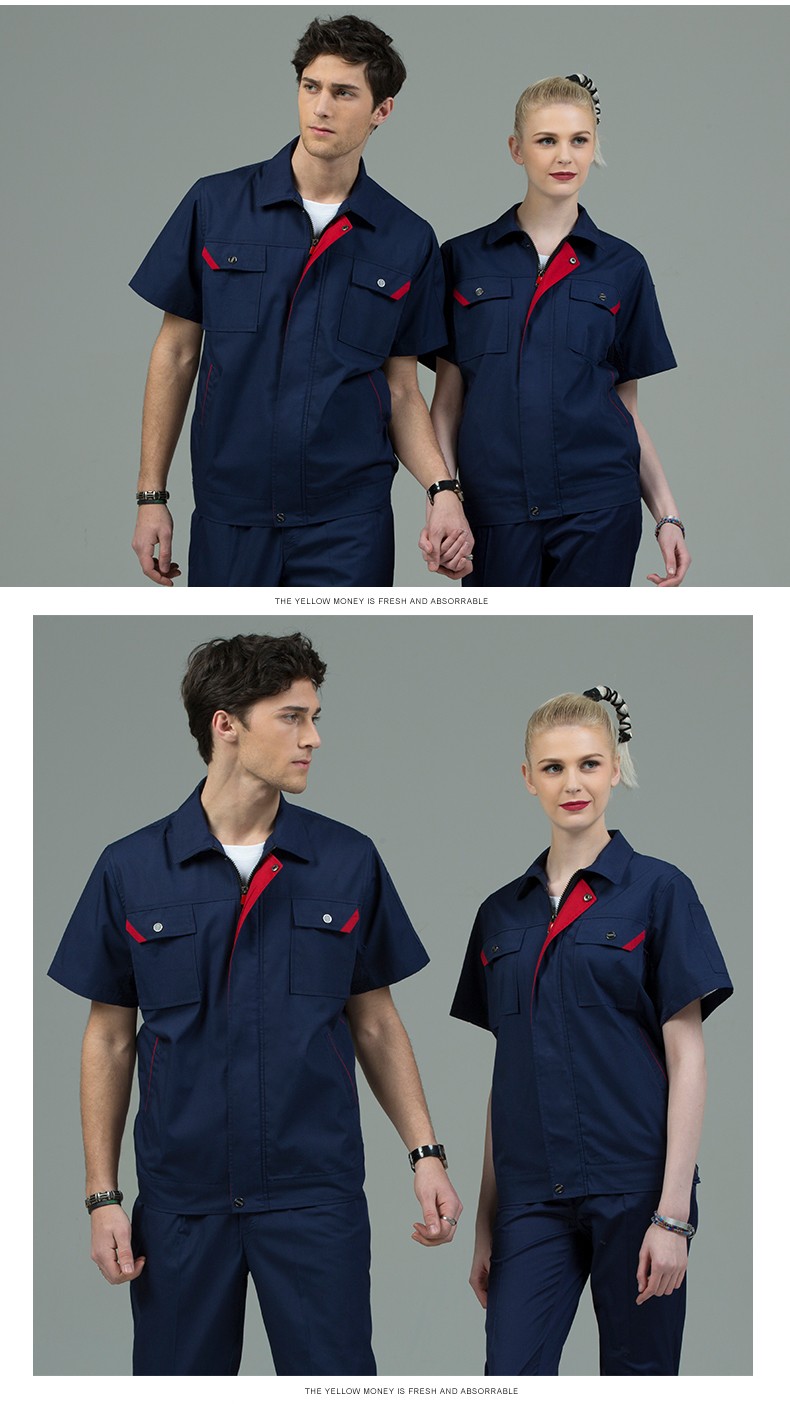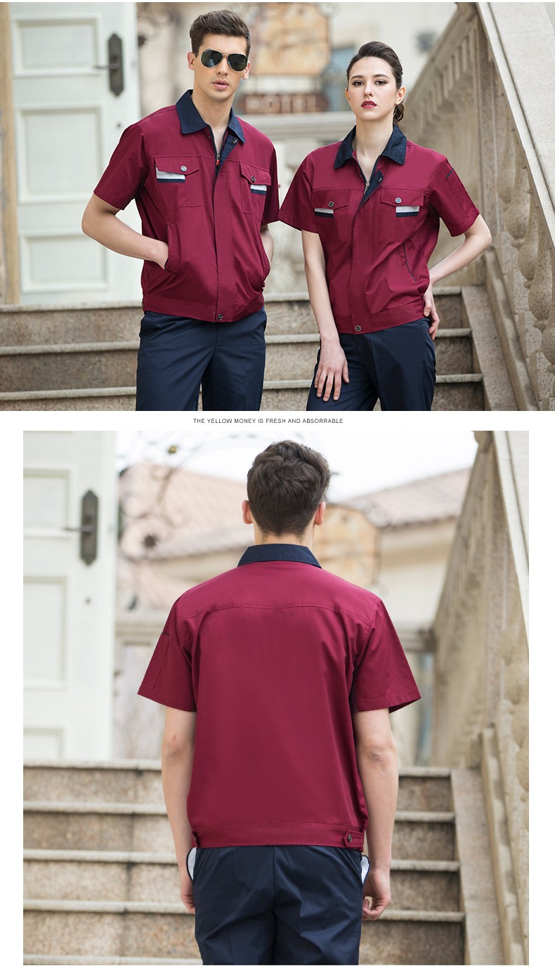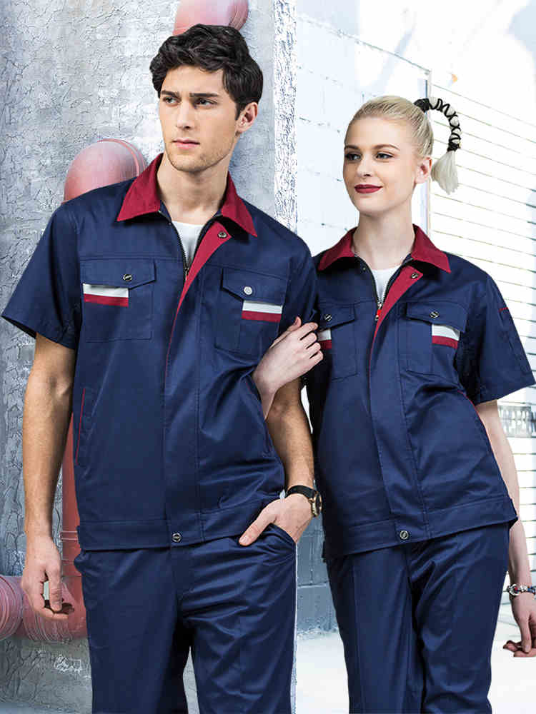 藏藍色加棗紅領短袖工作服,適用于物流運輸,建筑工地,工廠車間等工作環(huán)境
