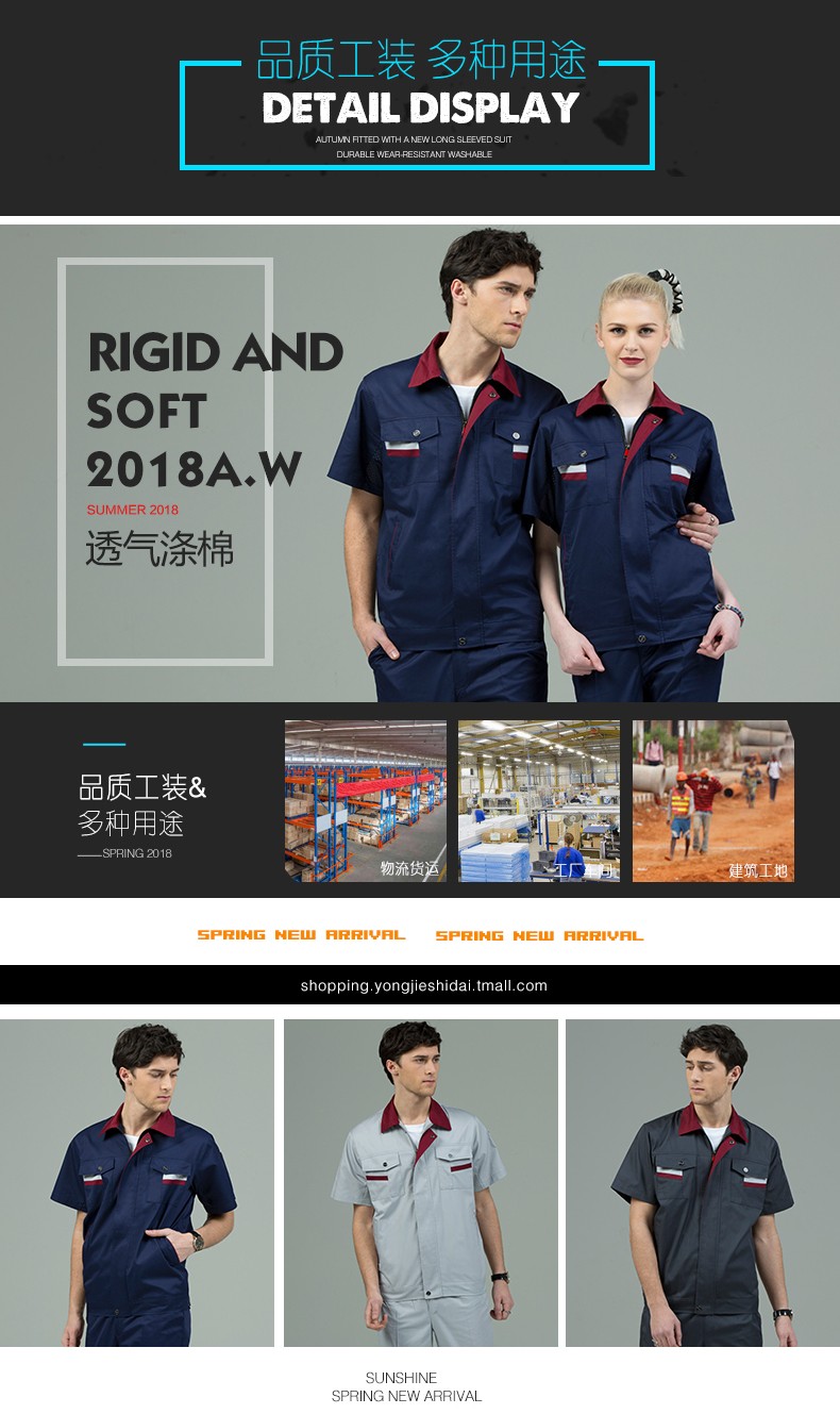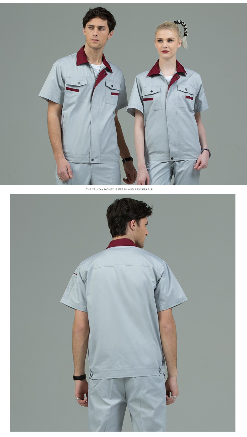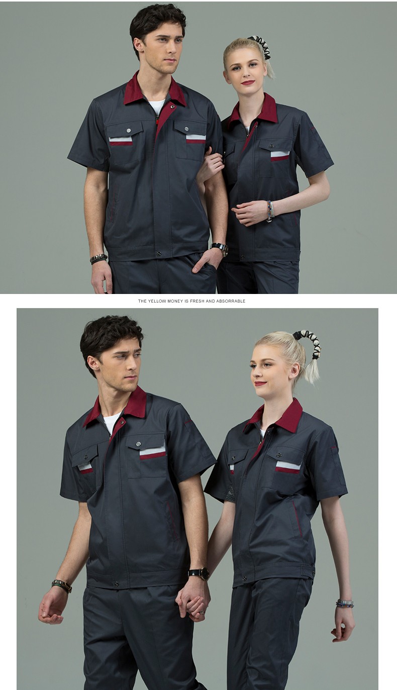 藏藍色加棗紅領短袖工作服,適用于物流運輸,建筑工地,工廠車間等工作環(huán)境